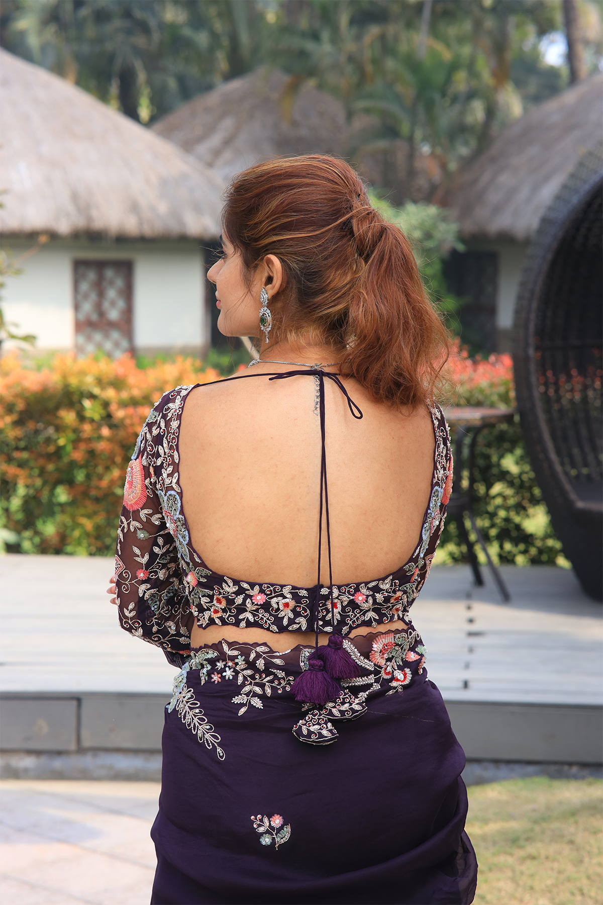 Wine silk organza embroidered Saree with full sleeve embroidered blouse